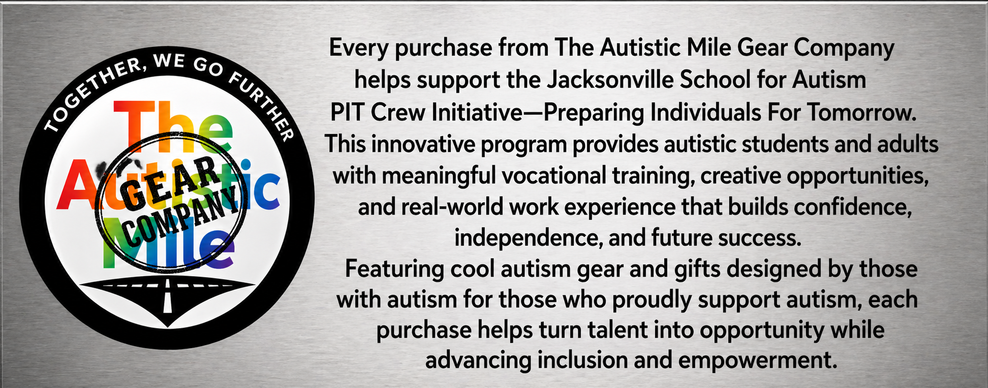 View Shopping Cart View Shopping Cart Learn more about the PIT Crew Initiative Learn more about the PIT Crew Initiative Donate to Jacksonville School For Autism Donate to Jacksonville School For Autism The Autistic Mile Store Clear Filters Filter Clear Filter Autism Fears Me Tee - Bold Awareness Graphic T-Shirt from $28.88 View Options Together We Go Further - Bold Awareness Graphic T-Shirt from $28.88 View Options I'm Autistic. What's Your Superpower? - Bold Awareness Graphic T-Shirt from $28.88 View Options No results found No results match your search. Try removing a few filters.